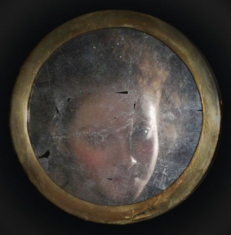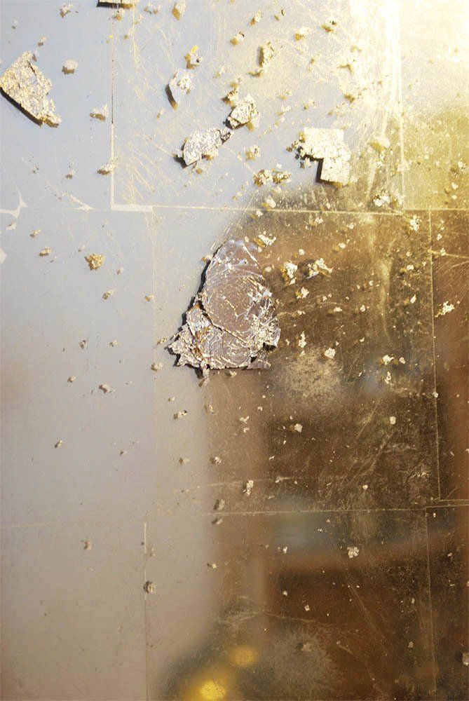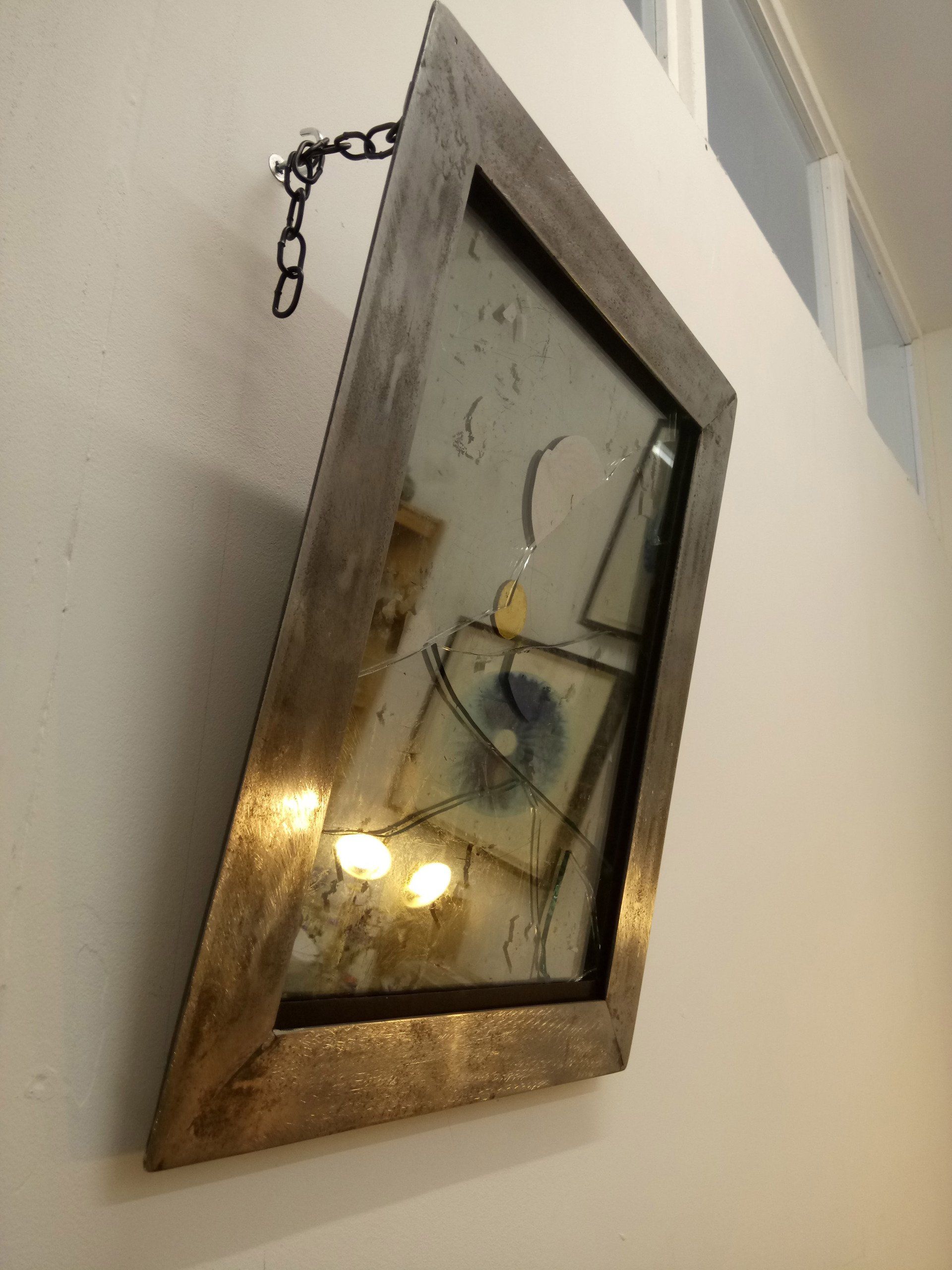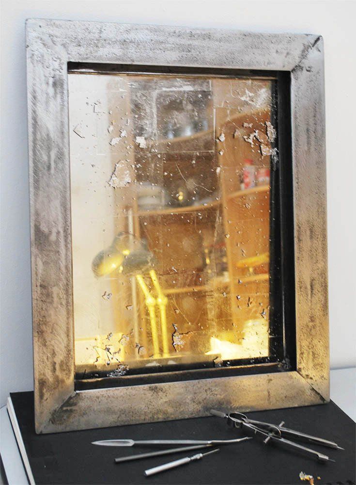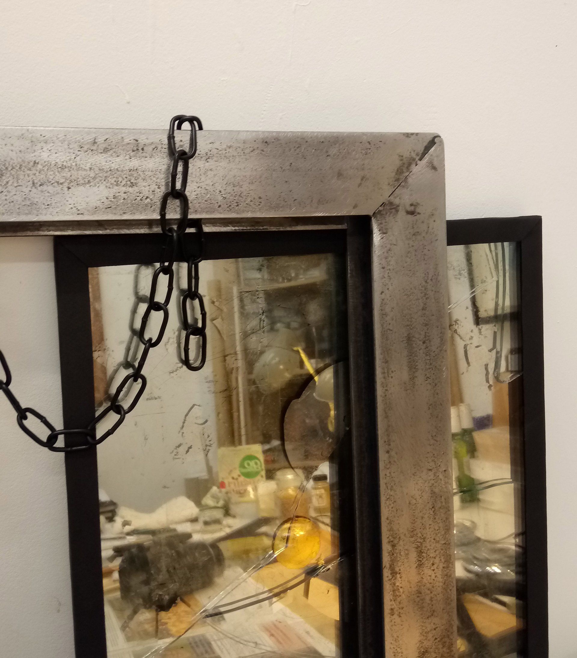 DARK MIRROR came about partly as a response to seeing the distant reflection of a young woman in the mirror of Iron Genie, partly as an exercise in TIG welding and gilding. The heavy steel frame and three layers of distressed glass gilded with grey Palladium leaf give the viewer a dark, distant and disembodied reflection. Shown installed with steel chains and zinc etching plates.