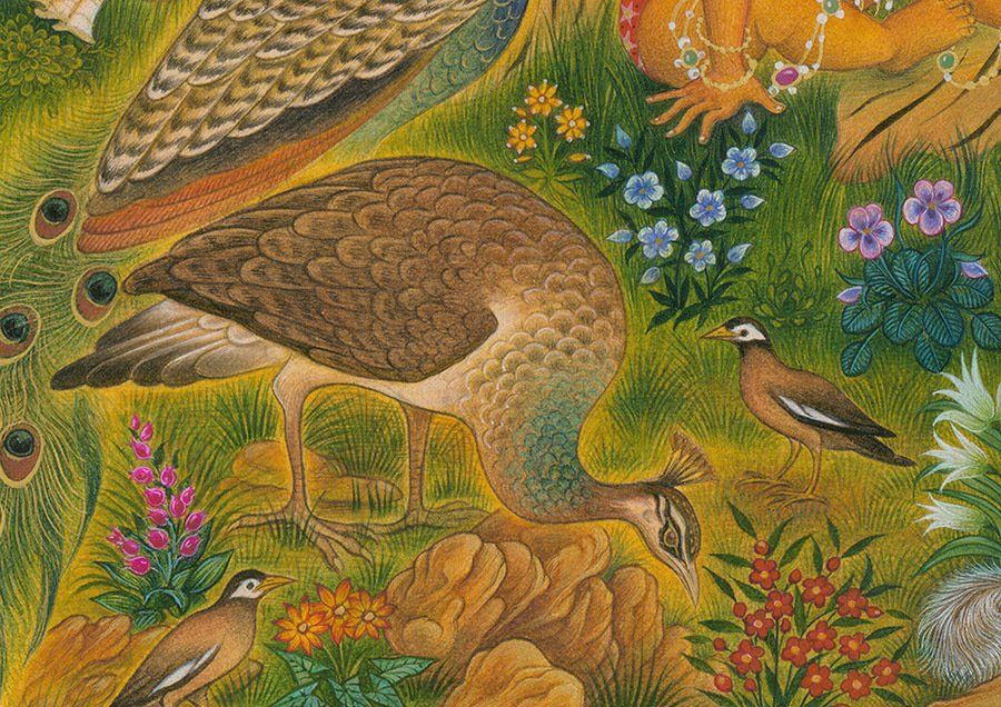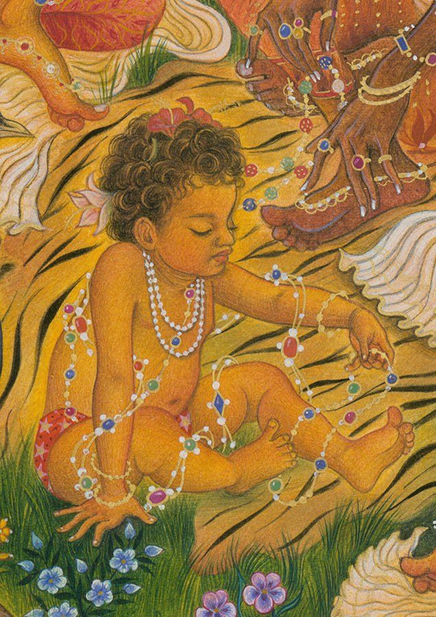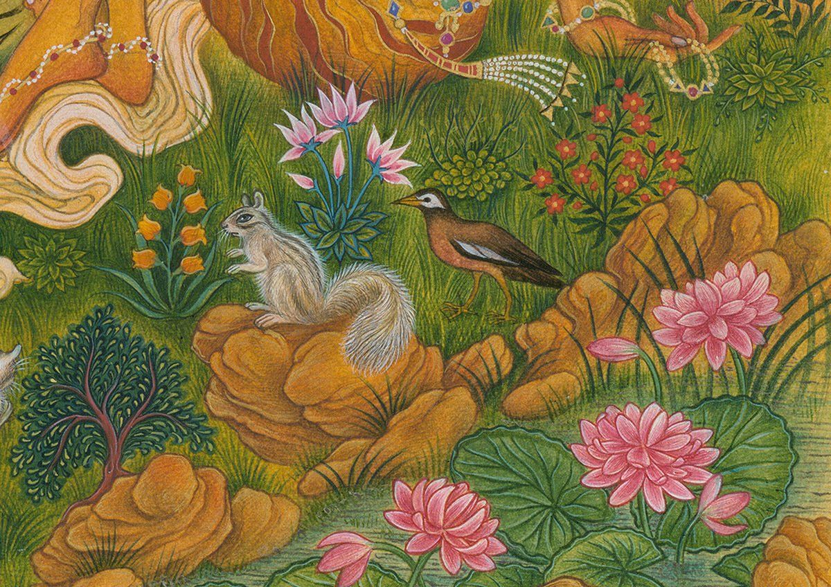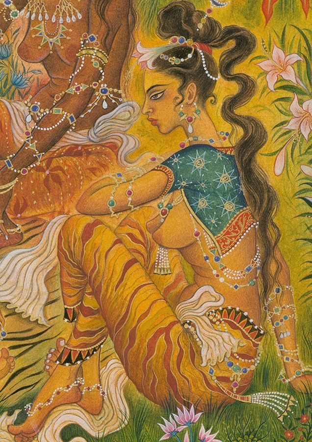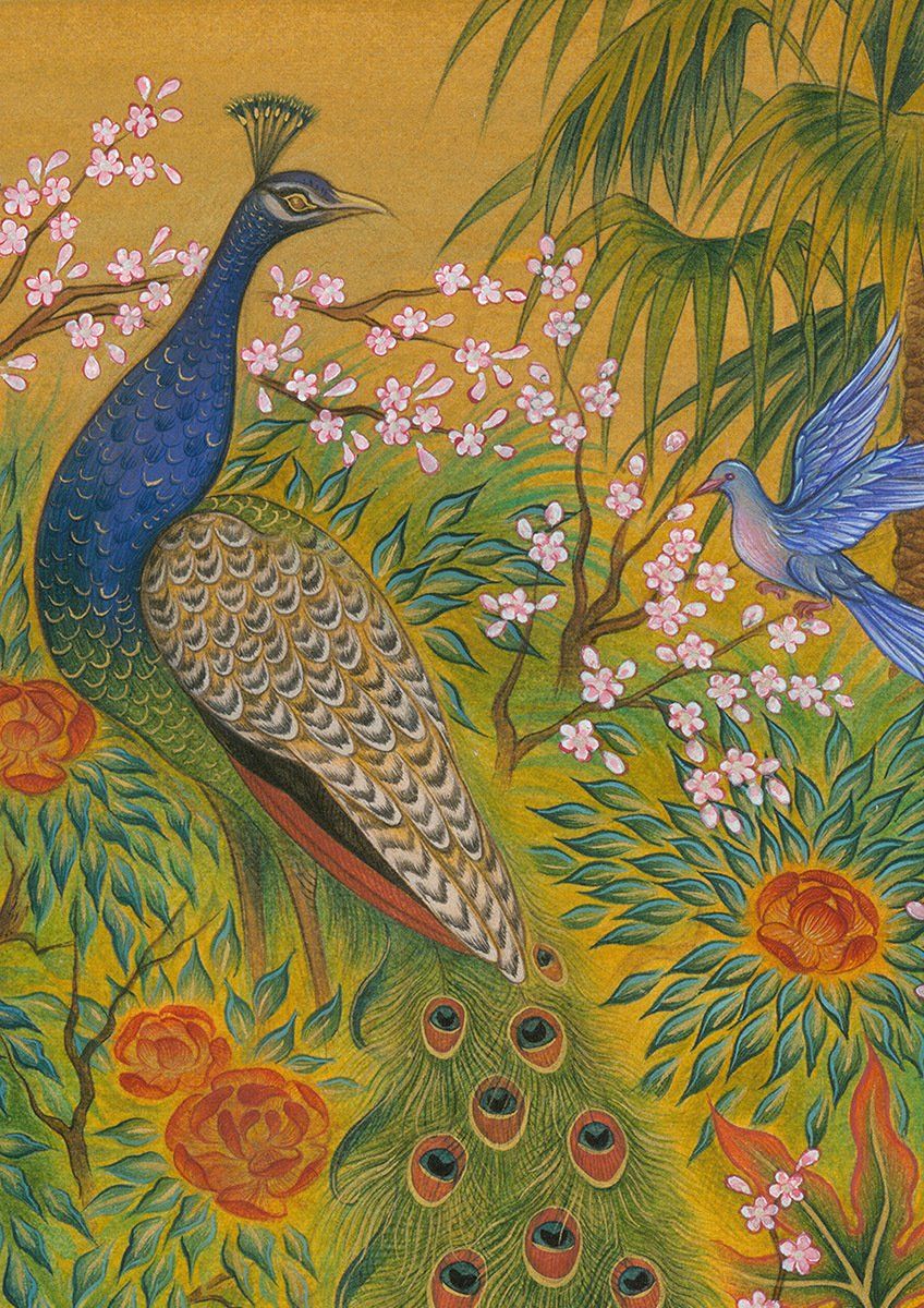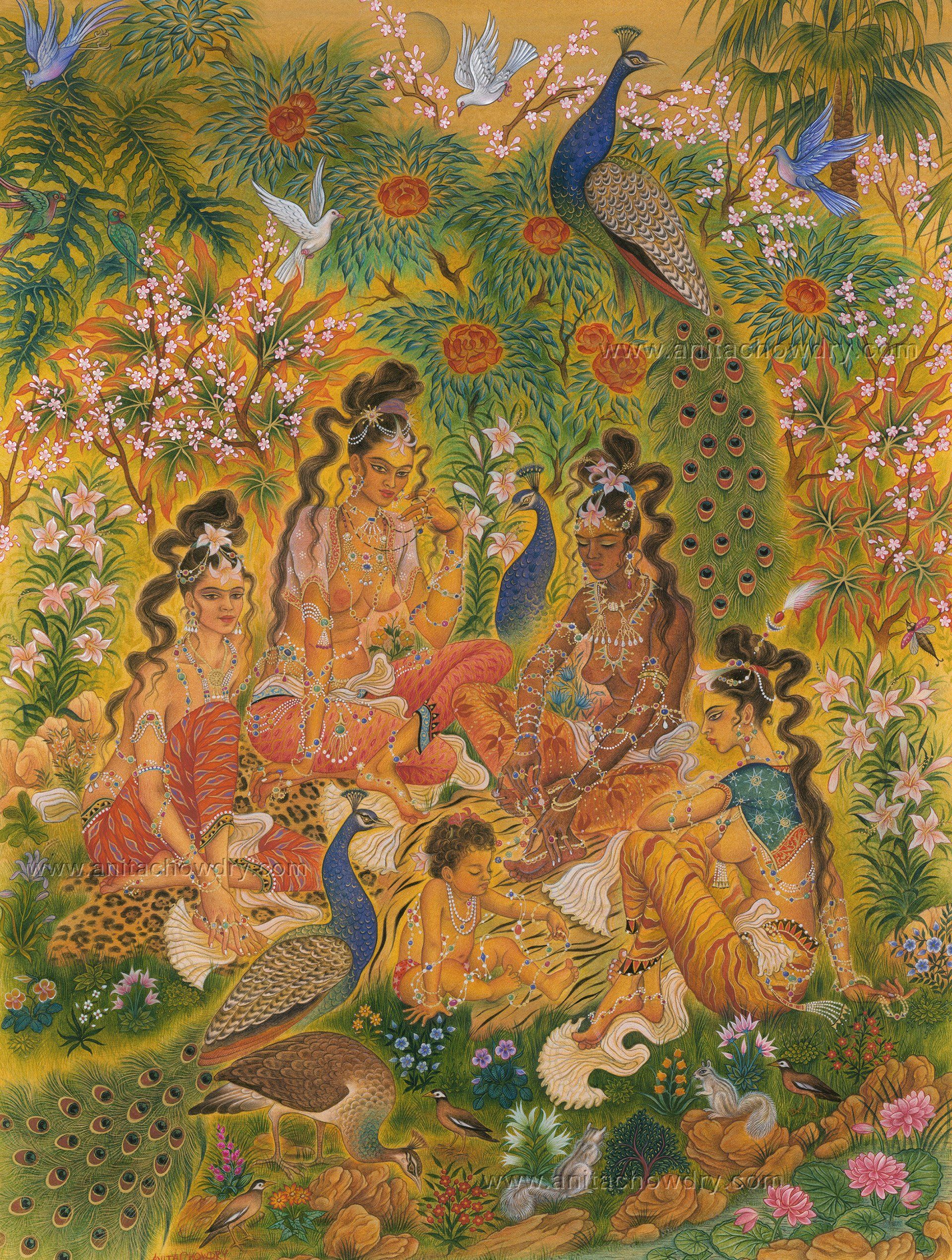 Dream Girls is a homage to my late Rajput master Bannu from whom I learned the techniques and sensibilities of Indian painting. It evokes the sensuality of early Buddhist murals at Ajanta, and the lyricism of 18th century Kishangarh painting. The Asparas or protective feminine spirits watch over a child in a garden of Eden. For more details about this painting, click the button below to access a Blog post.
