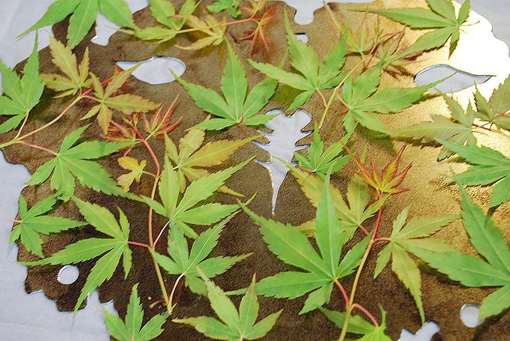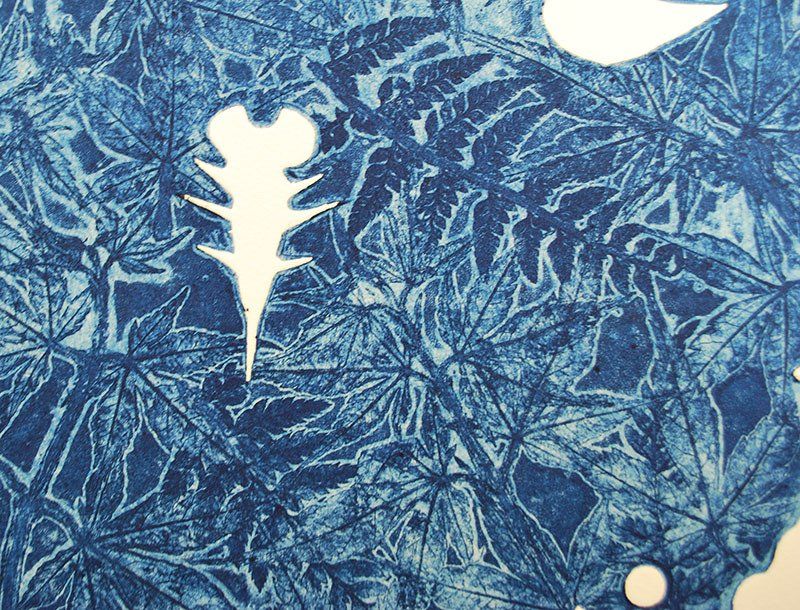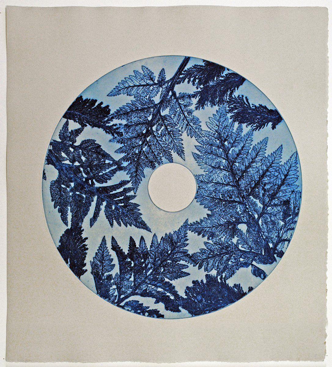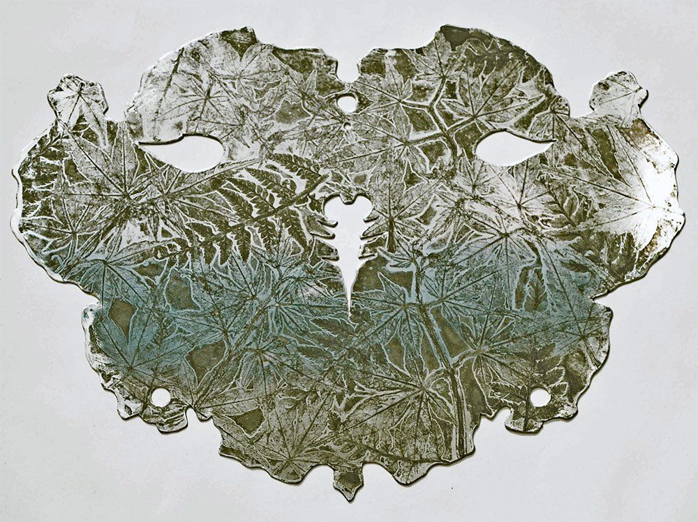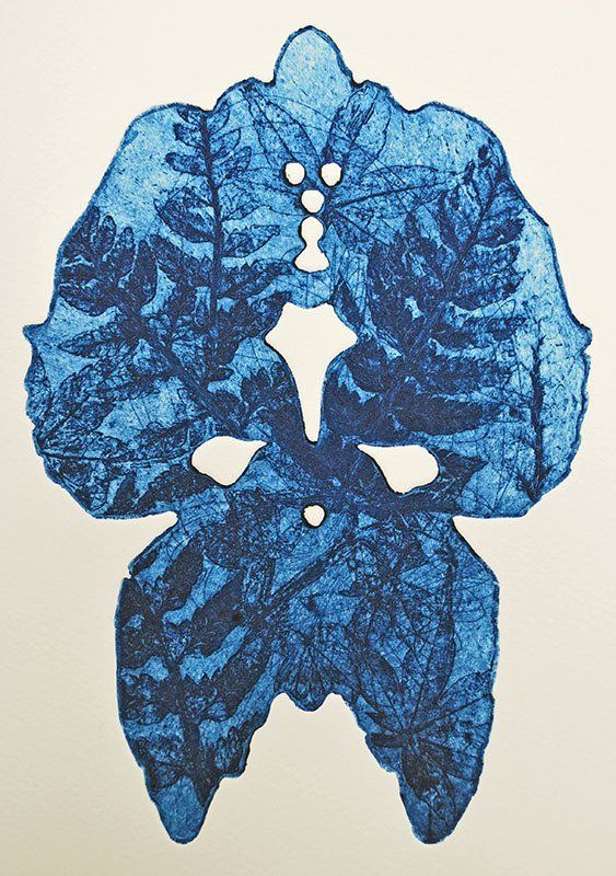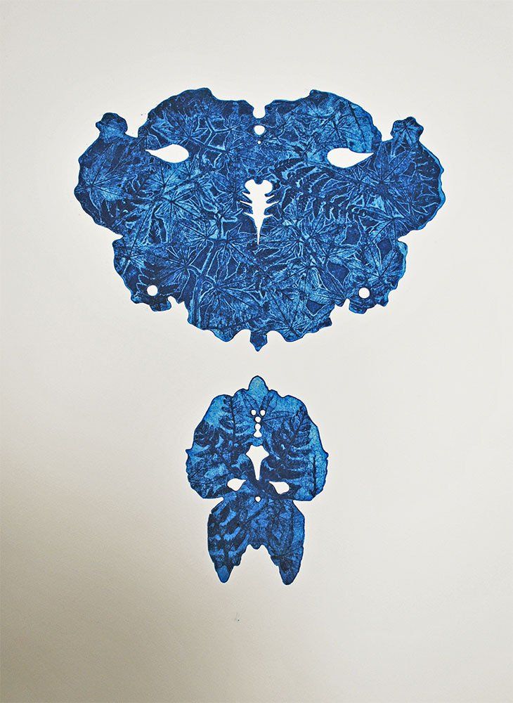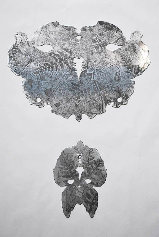 Rorshasch Ink Blots were the inspiration for these experiments in shaped etching plates. The zinc plates were first cut and finished with Dremmel tools and hand files. The plates were then etched with the impressions of fresh leaves pressed into soft-ground, before taking prints.