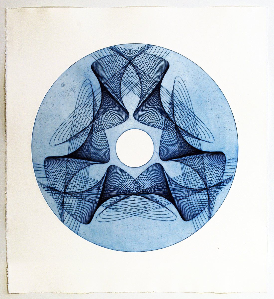 The Blueprint Tryptich is a series of three prints taken from zinc plates that were made for the tabletop of the IRON GENIE harmonograph sculpture. They represent 'blueprints' of the underlying natural geometries, printed with traditional Prussian Blue ink to evoke old-fashioned engineer's blueprints.