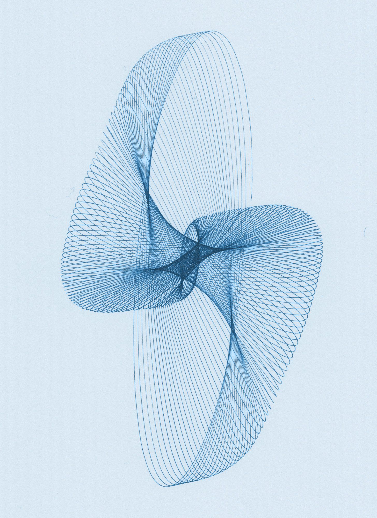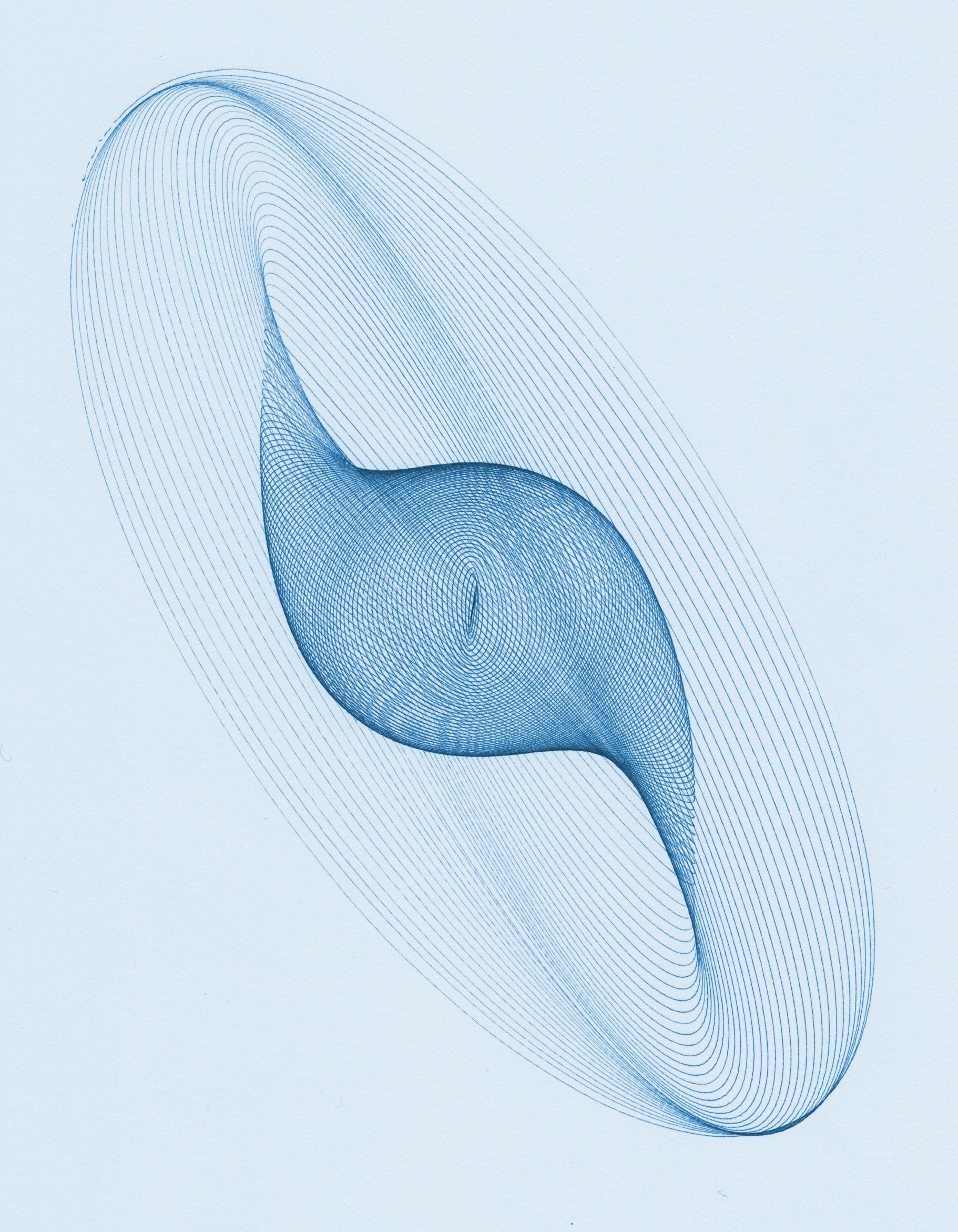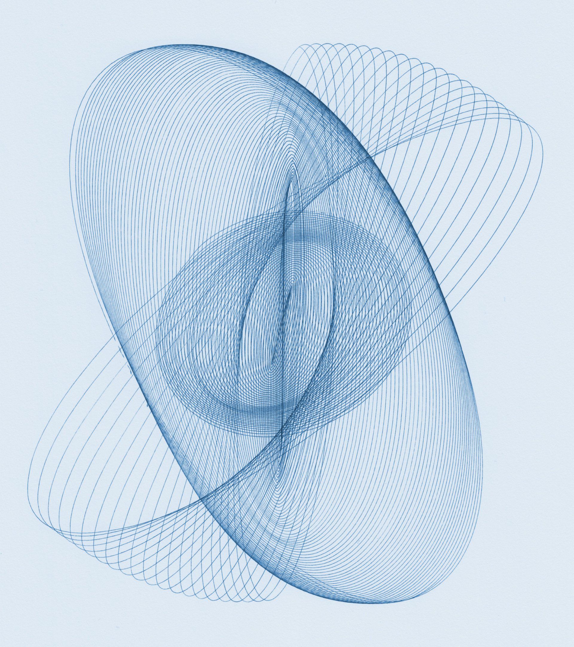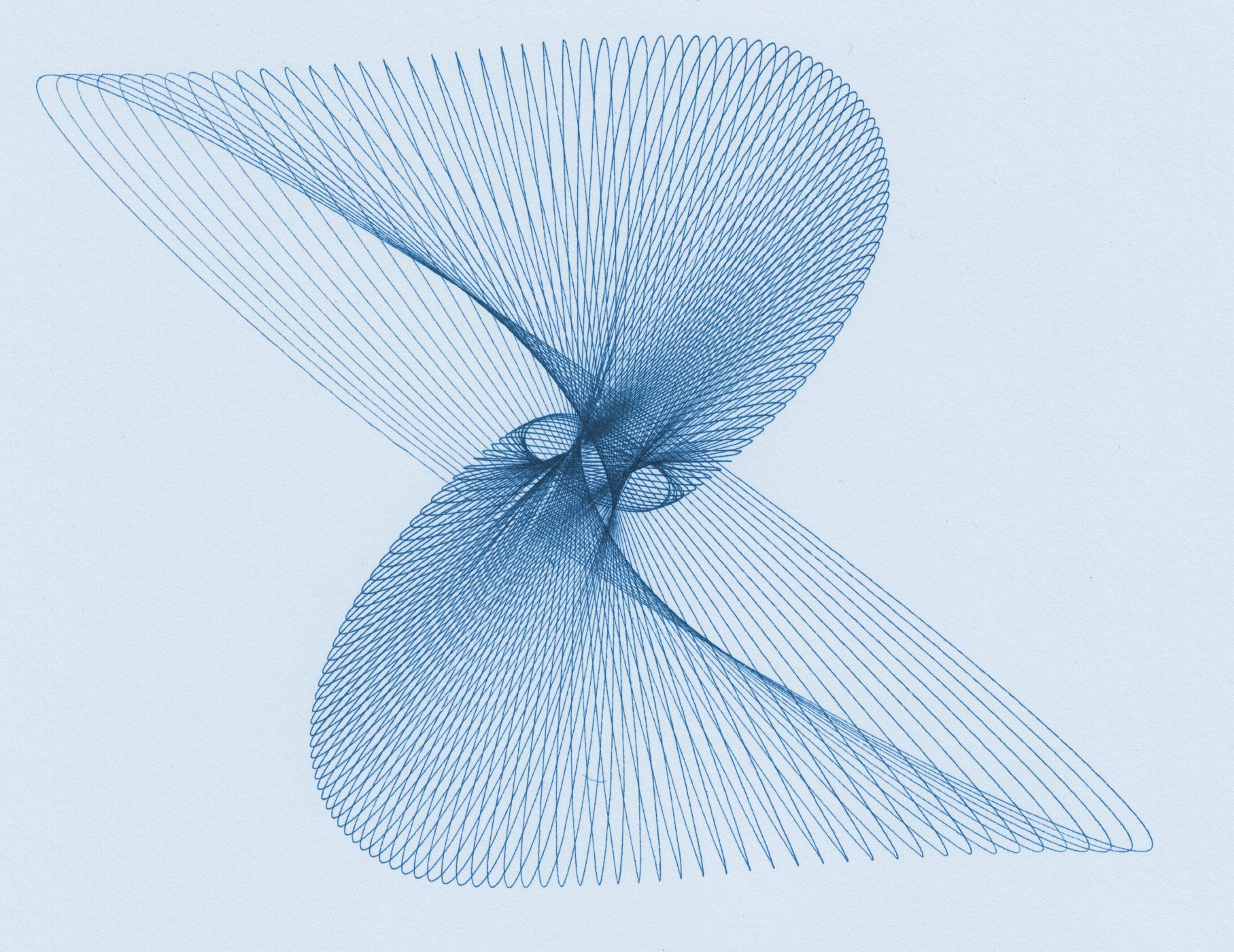A Selection of drawings created by Iron Genie. These are visual expressions of the interactions of pendulum frequencies driving the drawing platform and the stylus.