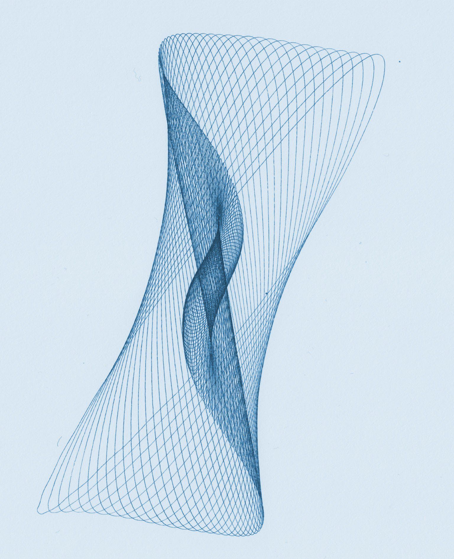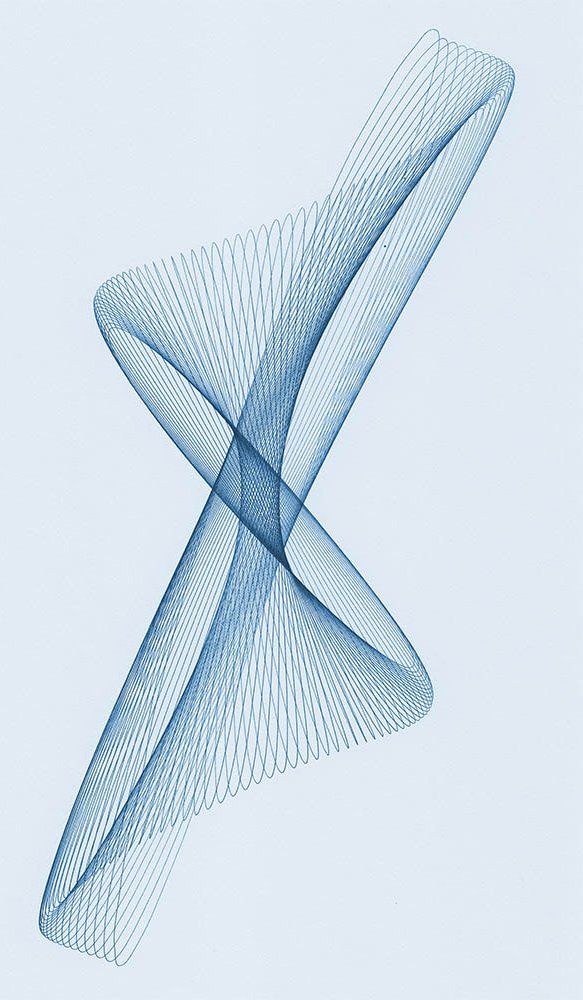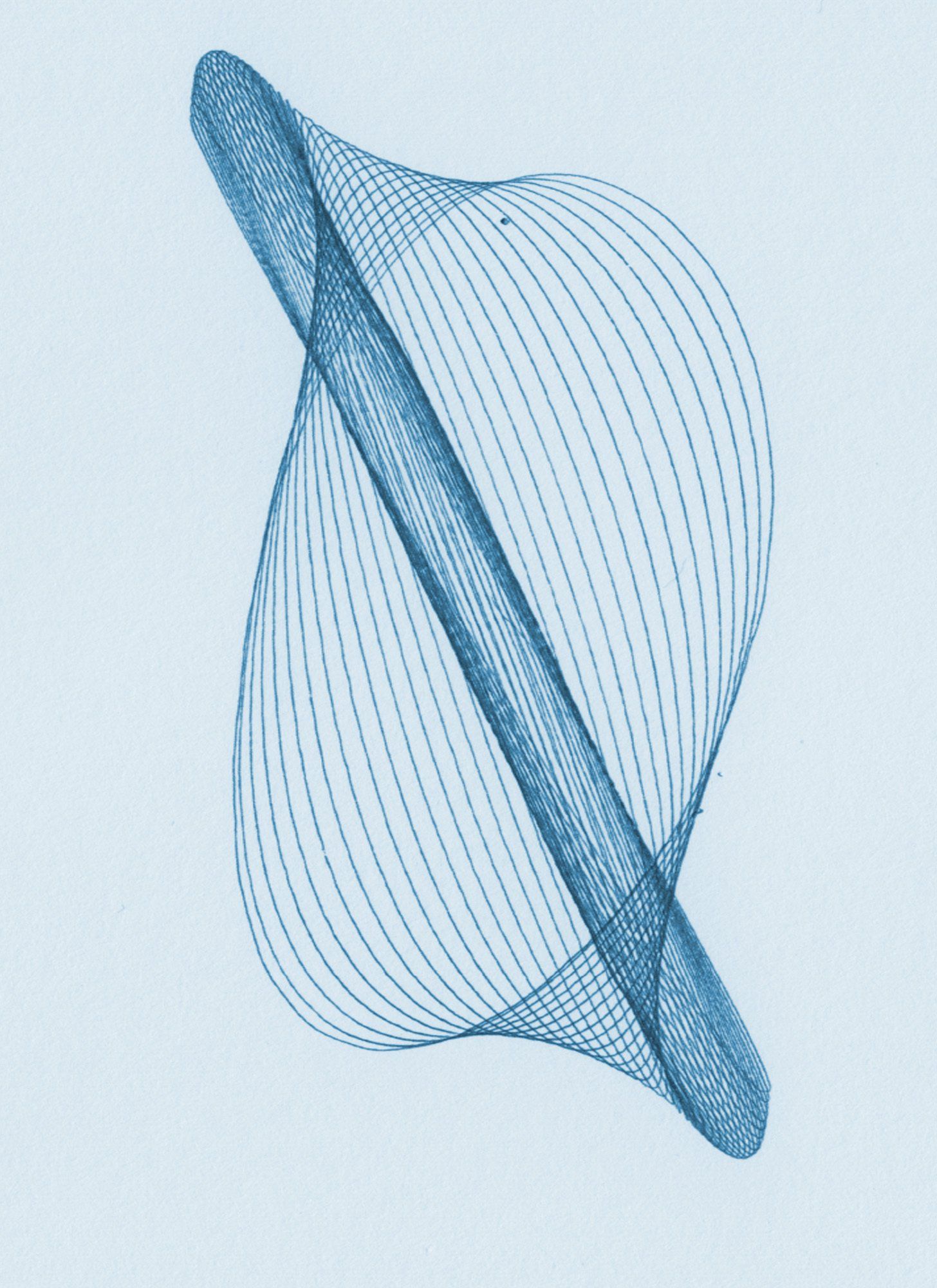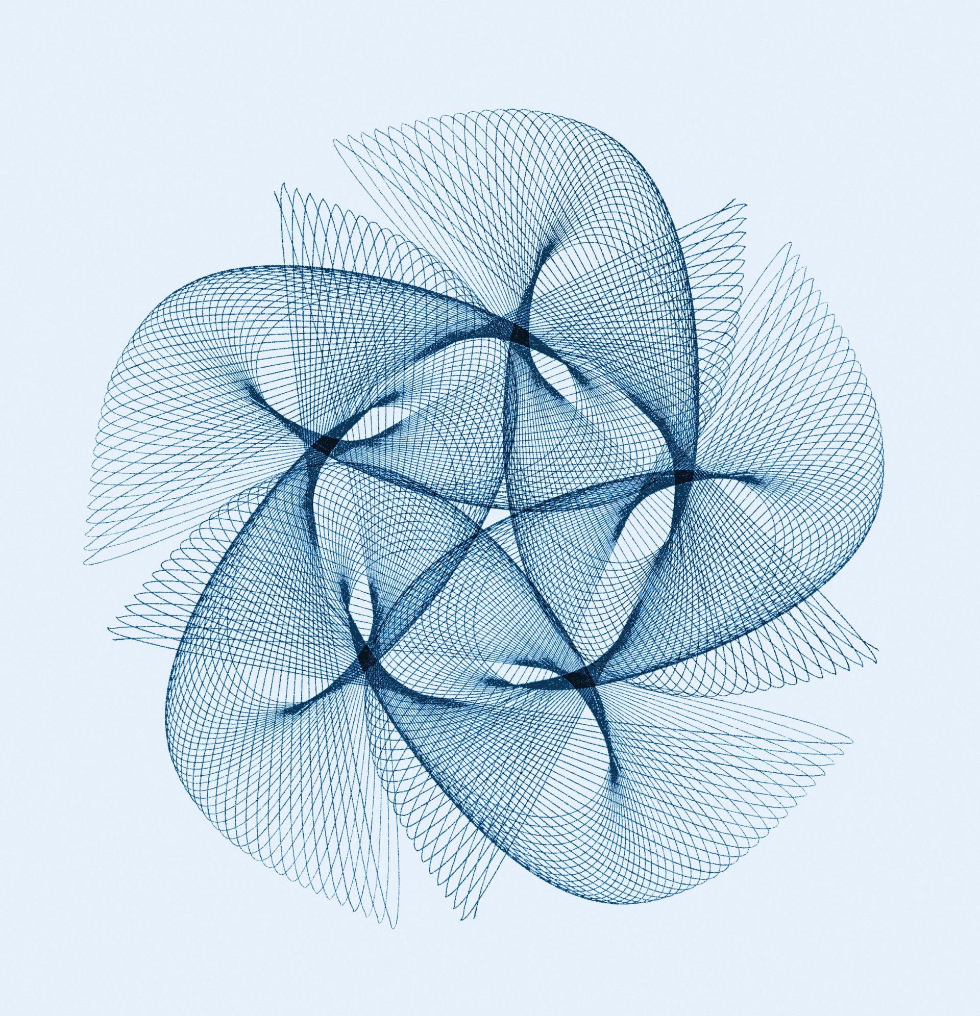 A Selection of drawings created by Iron Genie. These are visual expressions of the interactions of pendulum frequencies driving the drawing platform and the stylus.