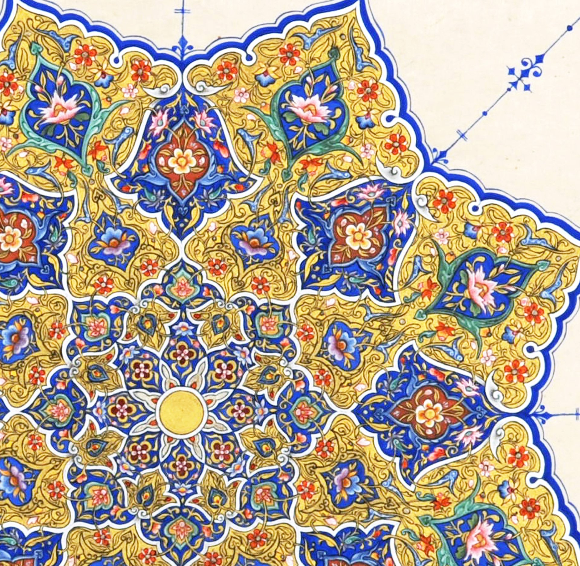 A series of works on paper using classic Islamic book-illumination techniques with historic mineral colours and gold. The paintings in this section were executed between 2009 and 2012, either as private commissions or exhibition pieces.