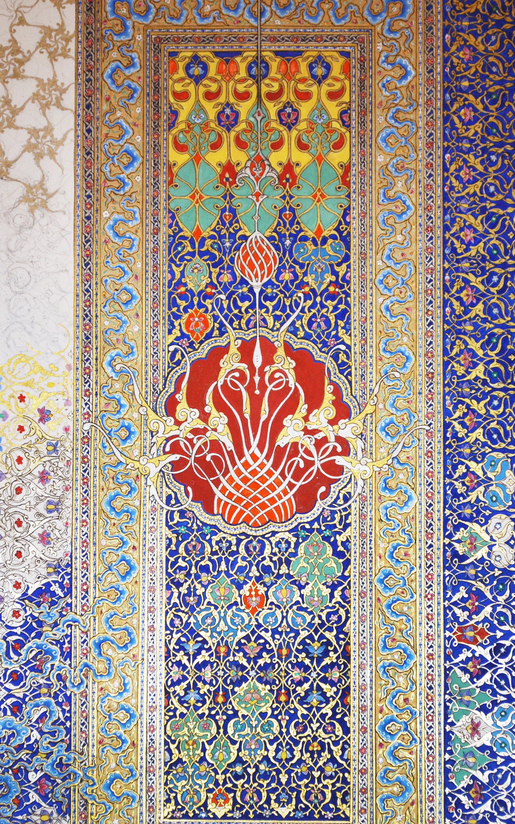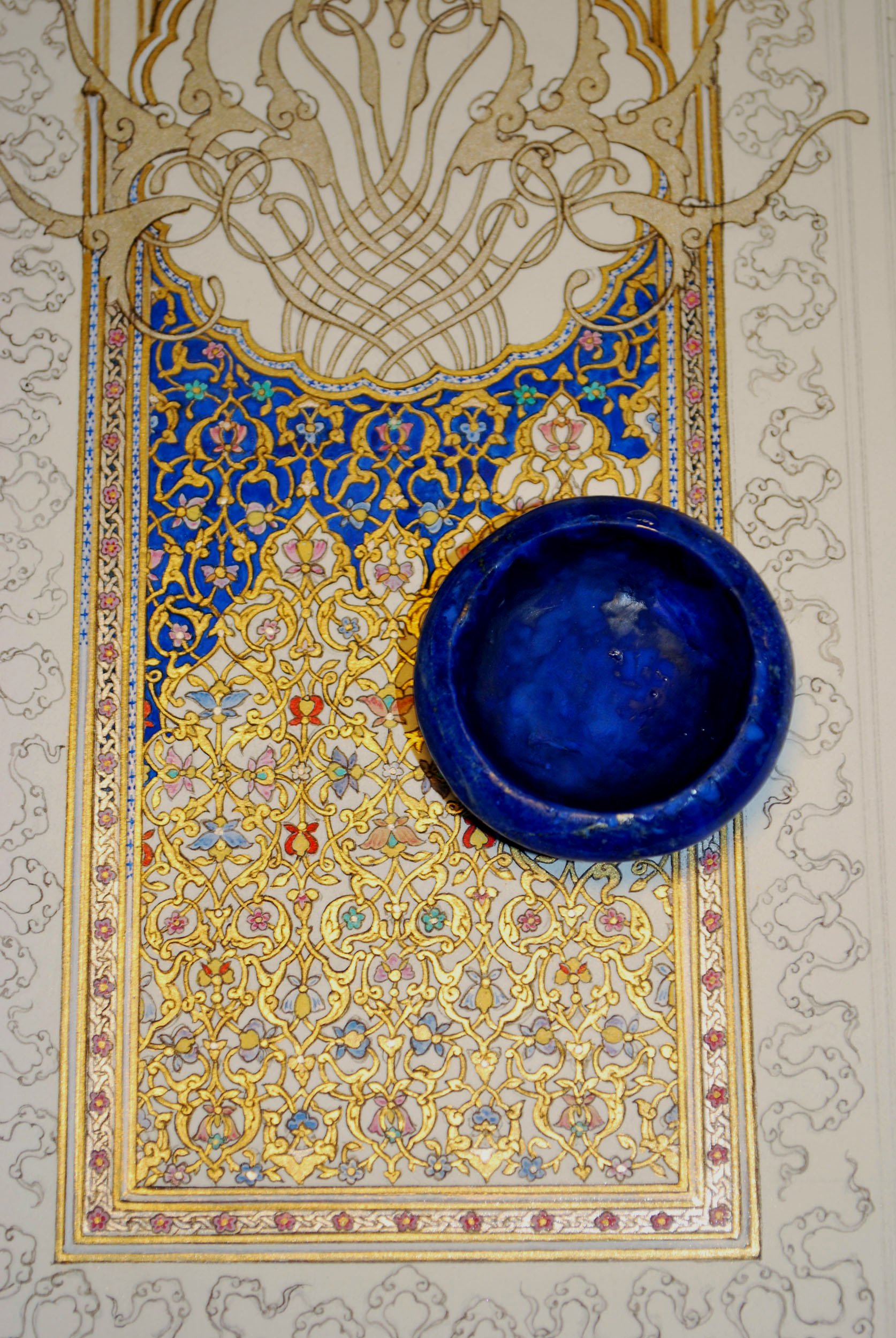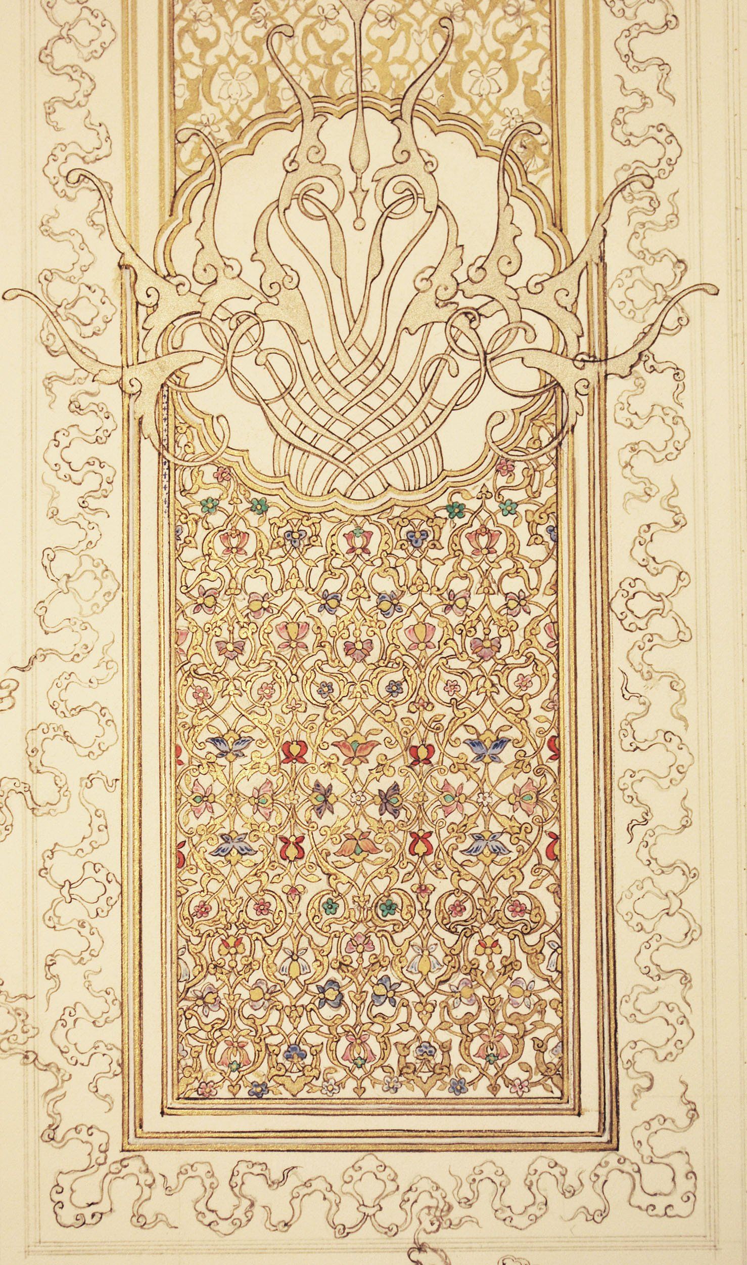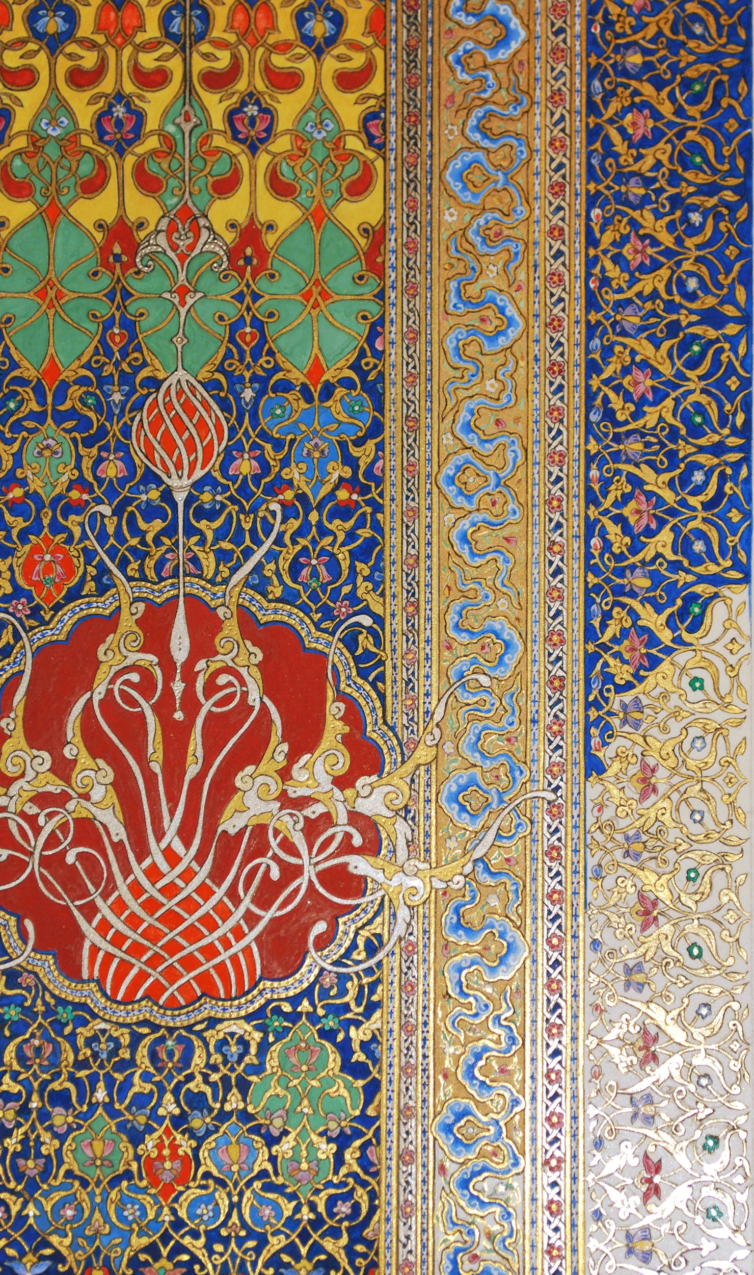 Inspired by the illuminated frontispiece of a mid-15th century book made in Shiraz for Turcoman Prince Pir Budaq, this is a contemporary interpretation of one of the high points of classic illuminated design.