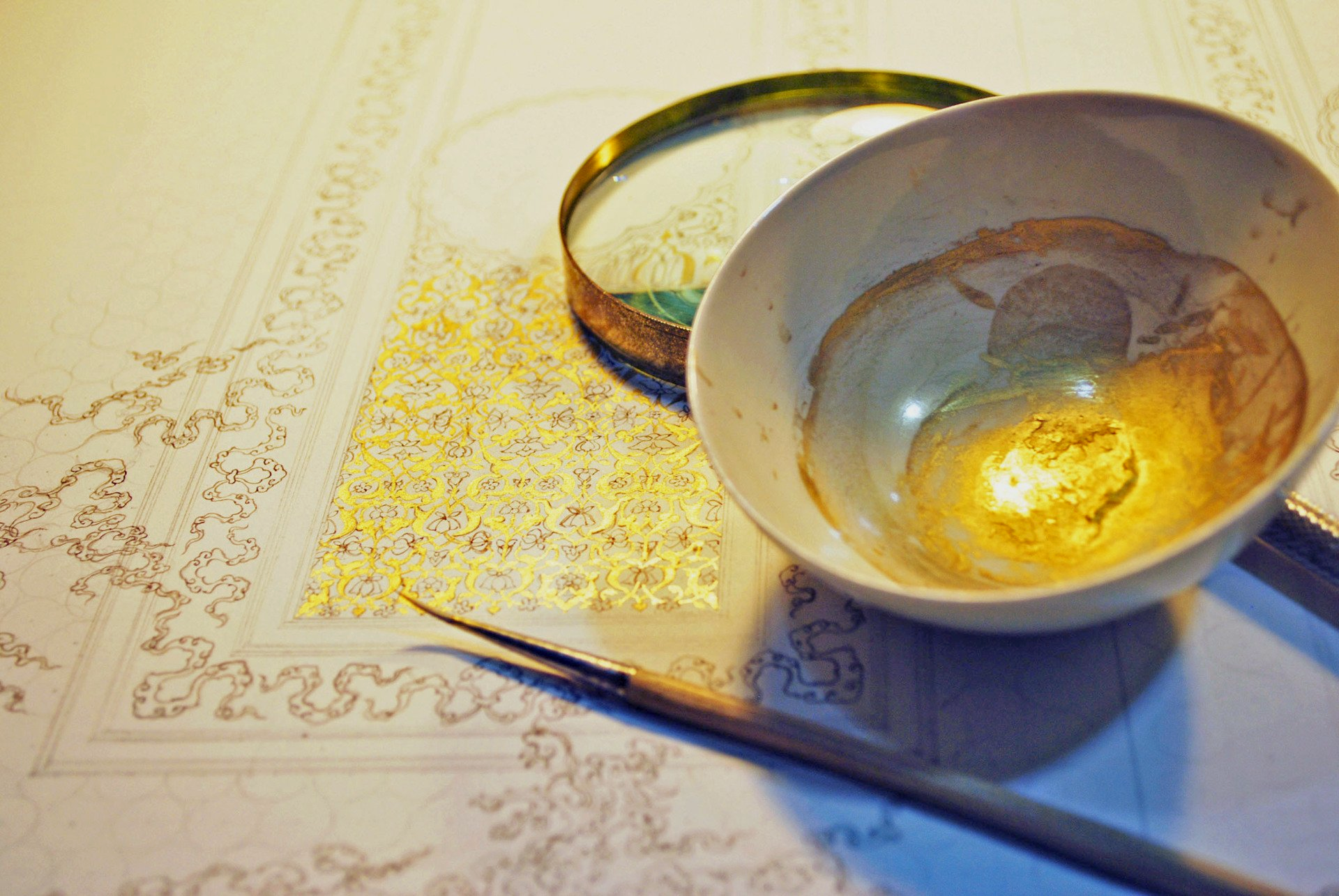 Working on Fabriano acid-free paper, with hand-made mineral pigments including Afghan lapis lazuli, malachite, cinnabar, orpiment and read lead, as well as gold, and silver.